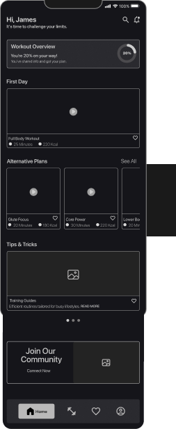Challenges: Complex apps with lengthy sign-ups, a packed schedule.Needs: Sign-up under 3 minutes, AI-driven personalization via body scanning, a simple home-based program with a coach that addresses James’s knee and shoulder injuries and supports his weight loss goal.